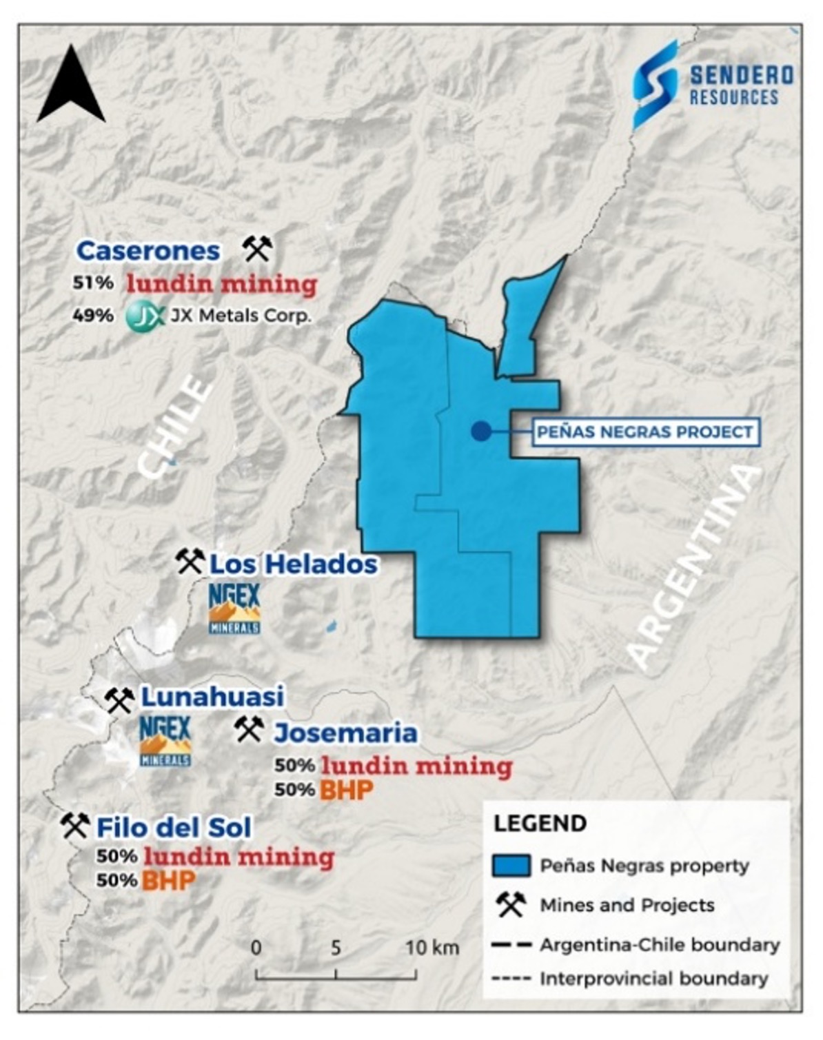 The Company is focused on copper-gold exploration at its 100% owned Peñas Negras Project in the Vicuña Belt in Argentina. The Peñas Negras Project has similar geological characteristics to other deposits in the Vicuña Belt and multiple porphyry and high-sulfidation epithermal targets have been identified on the project. The centre of the Peñas Negras concession area is situated approximately 18 km southeast of Caserones mine operated by Lundin Mining, approximately 24 km northeast of NGEx Minerals’ Lunahuasi project, and about 32 km north-northeast of BHP-Lundin Mining’s Filo del Sol advanced exploration and development stage project. The Company also has an option to earn an 100% interest on eight additional granted mining concessions covering 91.7 km2. The total project area comprises 211.77 km2